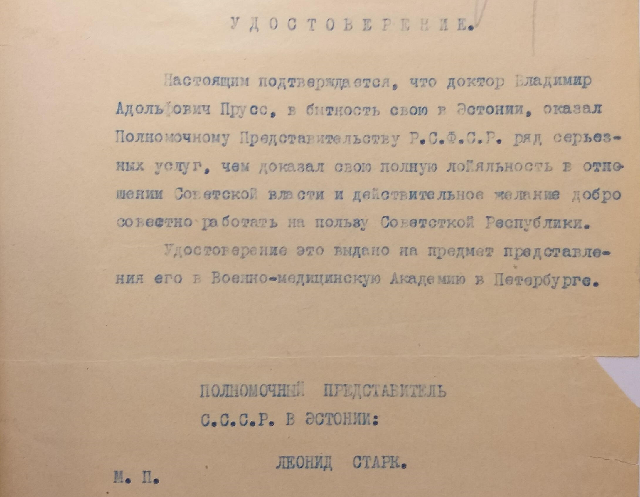 Затем вернулся в Выборг, забрал семью, которая там его ожидала, и уехал в Таллинн, где три года проработал фельдшером. В это время он дружил с полномочным представителем РСФСР в Эстонии Леонидом Старком. Позднее официальное письмо Старка о том, что Вольдемар Прусс оказал дипломатической миссии ряд услуг, помогло ему избежать репрессий. В 1923 году он вернулся в Петербург, некоторое время преподавал в Военно-медицинской академии, позже — работал в бюро рационализации Госпищетреста и Ленинградского завода оптического стекла.