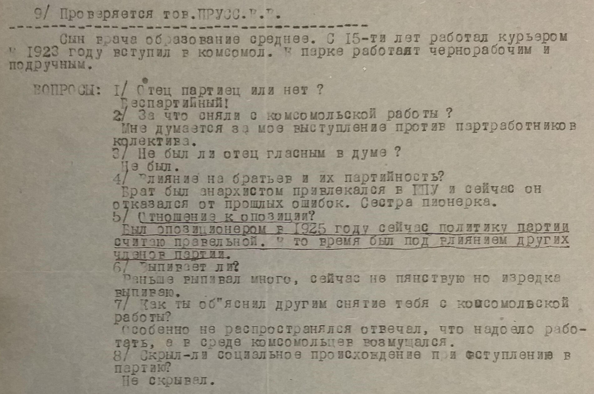 Во время учебы Владимир Прусс подрабатывал на разных должностях, в том числе чернорабочим и механиком в трамвайном парке имени Блохина на Петроградской стороне. На всех местах его работы рано или поздно всплывали неудобные факты о его происхождении — отец, Вольдемар Адольфович, был личным дворянином, служил в белых войсках, долгое время жил за границей. «Неблагонадежное» социальное происхождение и попытки его скрыть приводили к многочисленным «разборам полетов» в комсомольских организациях, протоколы которых сохранились в петербургском архиве ЦГАИПД. На одном из мест работы его также заметили в «опасных» разговорах и сочли оппозиционером-зиновьевцем.