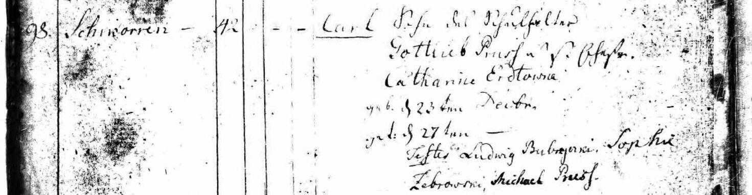 Дата рождения Карла Прусса — 23 декабря 1818 года — требует дополнительных подтверждений. Она известна из метрической книги прихода Страдаунен, согласно которой ребенок с таким именем родился в деревне Шикоррен (18 километров от Скоментнена) в семье Готтлиба Прусса и Катарины Эрдт. В пользу того, что Карл Прусс из Шикоррена и Карл Прусс из Скоментнена — одно лицо, говорит не только совпадение имени и фамилии и географическая близость населенных пунктов, но и форма девичьей фамилии матери в записи о рождении — Erdtowna. Славянский суффикс в те годы вряд ли использовали бы в фамилии этнической немки, но вполне могли придать фамилии польки или литовки, пусть и принявшей лютеранство. Это косвенно подтверждает сведения о литовских корнях Карла Прусса, известные из автобиографии его внука.В то же время ни в одном сохранившемся архивном документе, касающемся Карла Прусса из Скоментнена, не указаны ни имена родителей, ни дата и место рождения, поэтому все сходства могут объясняться случайным совпадением. Если в будущем будут найдены неопровержимые доказательства тождества двух Карлов, этот раздел станет вторым в рассказе об истории семьи, а первое место займет история Готтлиба Прусса и Катарины Эрдт.